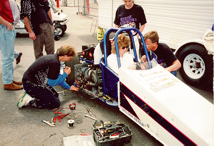 At the track, the dragster is towed around by a hybrid support vehicle. The golf-cart is battery powered and contains a gasoline powered generator for charging itself and emergency charging of the dragster. There is also an air compressor onboard for pumping up tires.