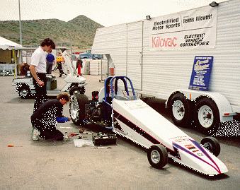 Electrified Motors Sports, of Laveen, Arizona is home of Dennis "Kilowatt" Berube's world record holding battery powered electric dragster, "Current Eliminator II." This world record is recognized (races were officiated and timed) by the largest drag racing sanctioning body, the National Hot Rod Association (NHRA). As far as we know, it is the quickest electric vehicle of ANY kind in the world. A world record in quarter-mile drag racing for an electric car was established by Dennis on (date), and reset a number of times by Dennis and his team. The standing record for elapsed time in the quarter mile is now 9.70 seconds @ 130 mph, on July 10th, 1999, breaking the 10 second barrier!!! WOW! Previous records include a 10.229 seconds @ 122.61 mph run at Bandimere Mile High Drags on May 22, 1999, a NEDRA event, and a 10.41 seconds @ 121.6 mph run on (late '98?), at Speedworld, northwest of Phoenix. Earlier in that year, March 7, 1998, he ran 10.86 seconds @ 110 mph at Firebird International Raceway, at the annual APS Electrics car races, during the National Electric Drag Racing Association (NEDRA) exhibitions. Four of the quarter-mile passes by Dennis that day were run in under 11 seconds! (The car has been reconfigured since this page was first written and the description and pictures herein pertain to the earlier configuration. An update is forthcoming). Some recent pictures of the car can be seen from the National Electric Drag Racing Association (NEDRA) web site at nedra.com. Here is one of them fetched from that site ...