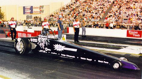 ... Current Eliminator III's Dennis Berube has been winning longer than most. Since he started in 1993, Berube, from Phoenix, Arizona has remained the man to beat. He regularly races , and humiliates, hardened gas-guzzlers. Berube's confidence is such that recently offered a $1,000 bounty to anyone who could beat him over the quarter mile. Is he expexting to pay up today? "No. The wager's off now," he announces, I gave it to the kids in Denver after the school shooting. I used it to set up a fund to get the children interested in racing."