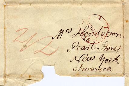 A number of the letters were addressed to my 4th-great-grandmother, then living in New York City. One of the letters, shown here, was postmarked 28 Dec 1815 addressed to her, Mrs. Henderson, Pearl Street, New York City.