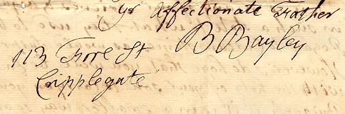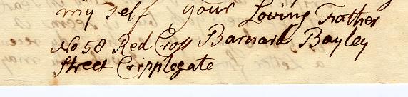 Some information new to me was the return addresses penned by her father, Barnard Bayley; one of No. 58 Red Cross Street, Cripplegate, and another of 113 Fore Street Cripplegate. The dateline of the letters indicated that they had been written in London.